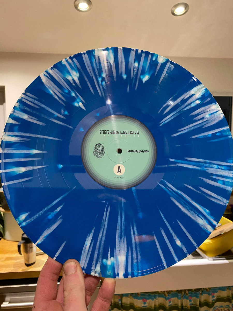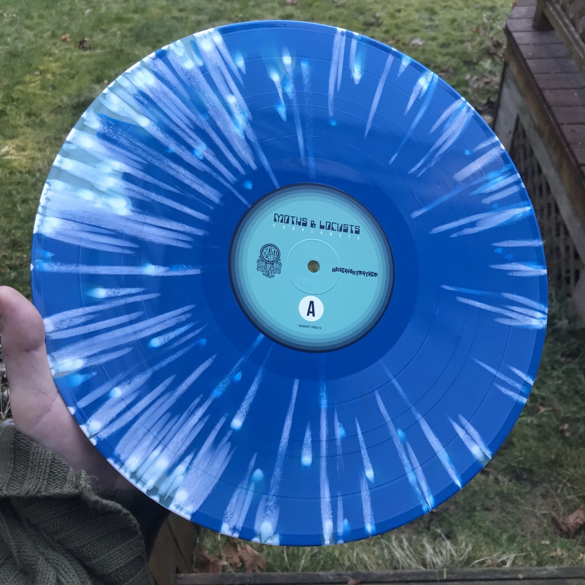 2nd edition LP pressing on 140gm translucent WARP 9 BLUE/BLUE SWIRL with WHITE SPLATTER vinyl, in beautiful 4/1 LP jackets, cover designed by Mauro Dalla Costa at UFF Serigrafie here in Nanaimo BC. Limited 2nd edition of 100 copies split between NoiseAgonyMayhem and the Weird Beard.